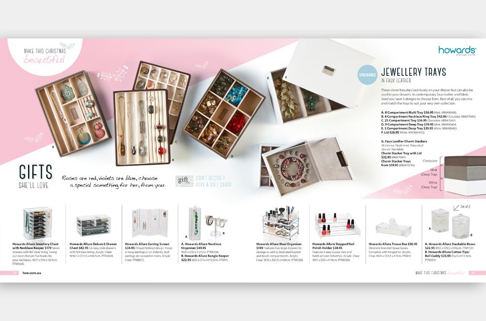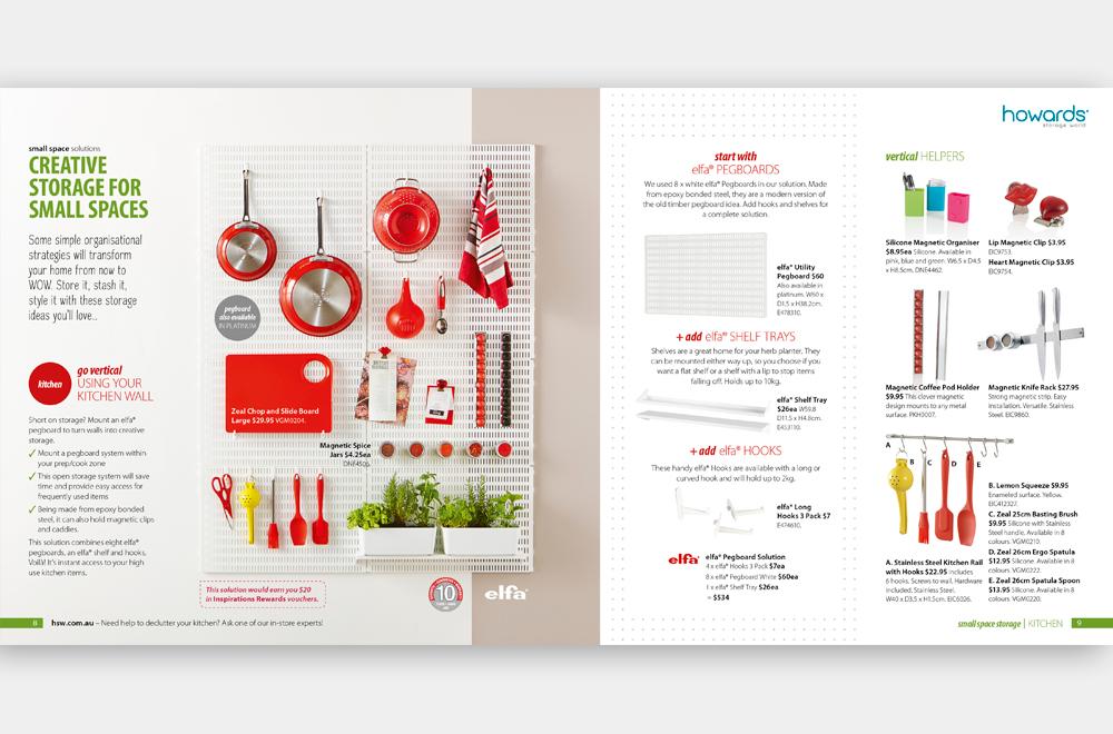 Howards Storage World is a global retail franchise operation that specialises in space saving and organisational products for the home and office.We'd been producing their 100 page product catalogues for over 12 years. And more recently we were also instrumental in helping them transition their total brand communication to a content lead strategy. Our brief is to continue to inspire their customers with the possibilities and pleasure that comes from utilising Howards products around their home. The new content strategy involved using bloggers to give hints and tips; customer stories; buyer insights and professional advice; along with inspirational photography (shot in our studios) to show customers the benefits of the products. These engaging stories are now accessed through various media including video, digital magazines, content driven catalogues and online. |