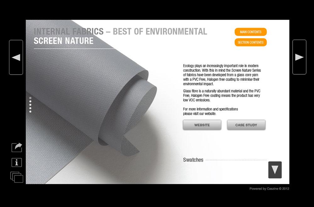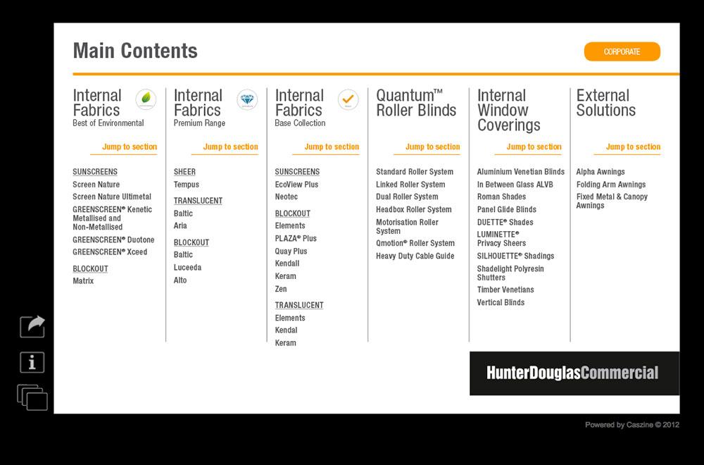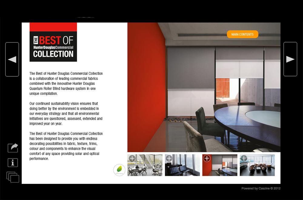 Hunter Douglas, the world market leader of quality window coverings, has celebrated its 60th year in Australia.With a proven reputation for delivering innovative internal and external shading solutions, fabrics and components that are technically superior and aesthetically unique, Hunter Douglas is at the forefront of technology and innovation. Hunter Douglas asked us to use our CASzine Interactive Digital Publishing platform to produce a substantial (100pp+) digital catalogue of their Commercial products. The navigation is distinctively catalogue-style with quick jump-links between section and products. The extensive analytics allow Hunter Douglas to determine which products are most popular through time spent and visits recorded, including return visits. |